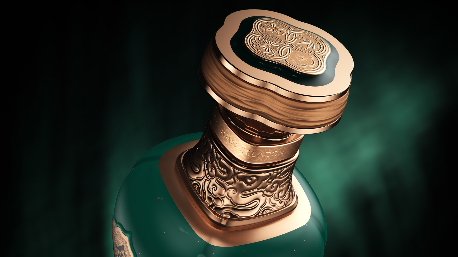 A soft jade green glaze envelops the bottle, bringing a warmth that recalls the subtle glow of polished jade. The colour feels calm and refined, perfectly echoing the brand’s philosophy of being humble yet elegant. Metallic accents provide a gentle contrast against the smooth glaze, allowing tradition and contemporary luxury to quietly converse across the surface. The result is a bottle that feels more like a crafted object of beauty than simple packaging, where heritage, craftsmanship, and modern design come together in a form that feels both graceful and memorable.