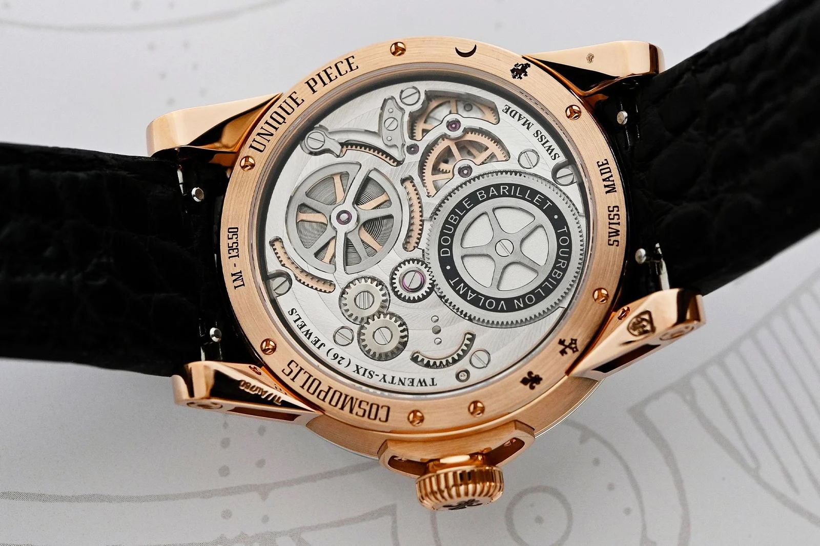 COSMOPOLIS features an off-center flying tourbillon rested on the subdial at 6 o'clock for a touch of horological brilliance. This feat of horological engineering spectacularly defies gravity, adding to the timepiece's allure. The hand-wound movement, powered by two barrel springs, offers an impressive 96-hour power reserve, ensuring that the COSMOPOLIS remains a reliable companion on your journey through time.