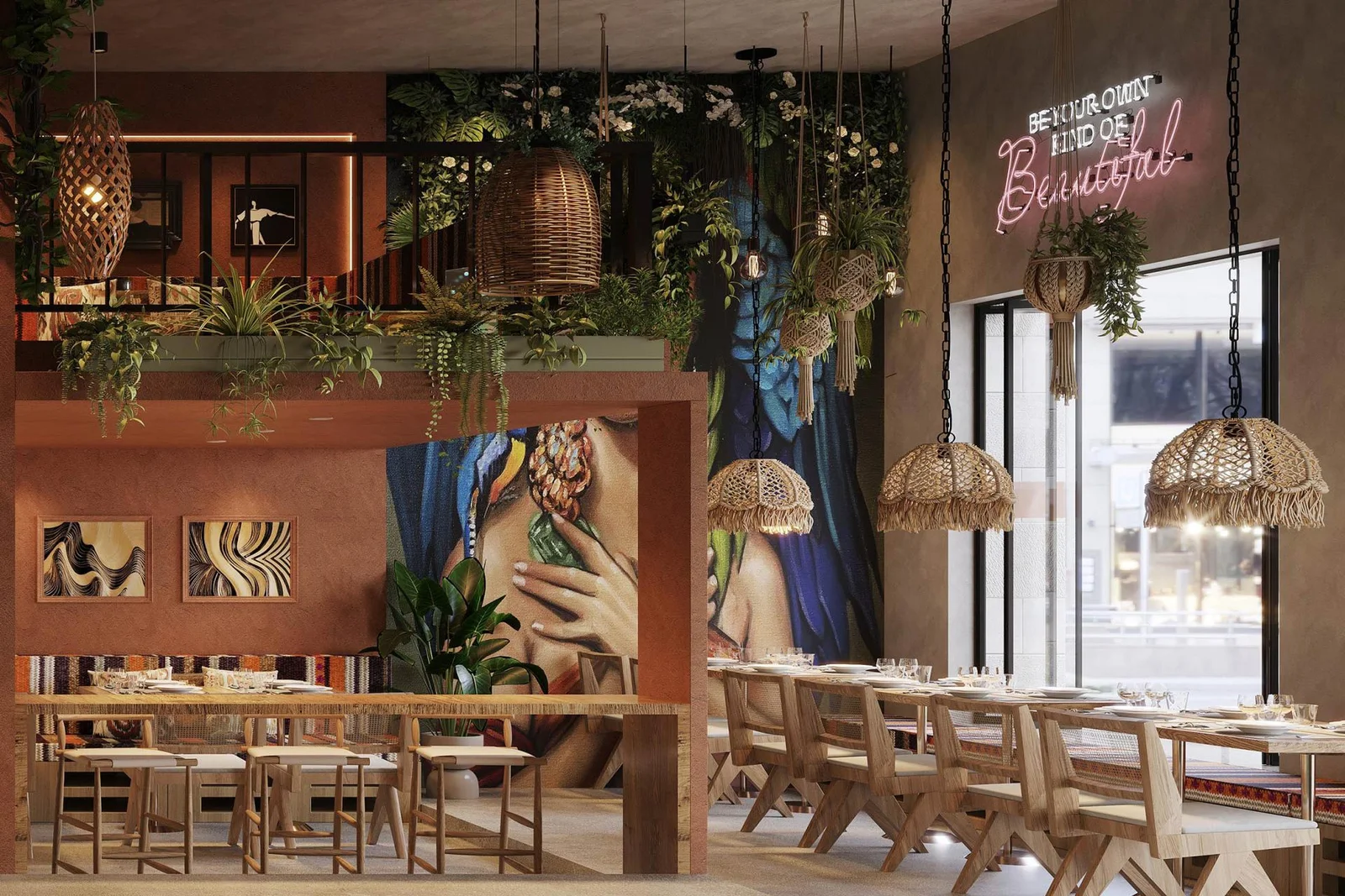 As you step through the expansive windows, the warm embrace of brick red walls, awash in the artistic flair of hand-drawn murals, instantly transports you to a world brimming with cultural richness. Natural textures abound, with Brazilian rattan and linen accents adding a touch of organic elegance. The carefully curated collection of South American hanging paintings deepens the immersive experience, whispering tales of distant lands.