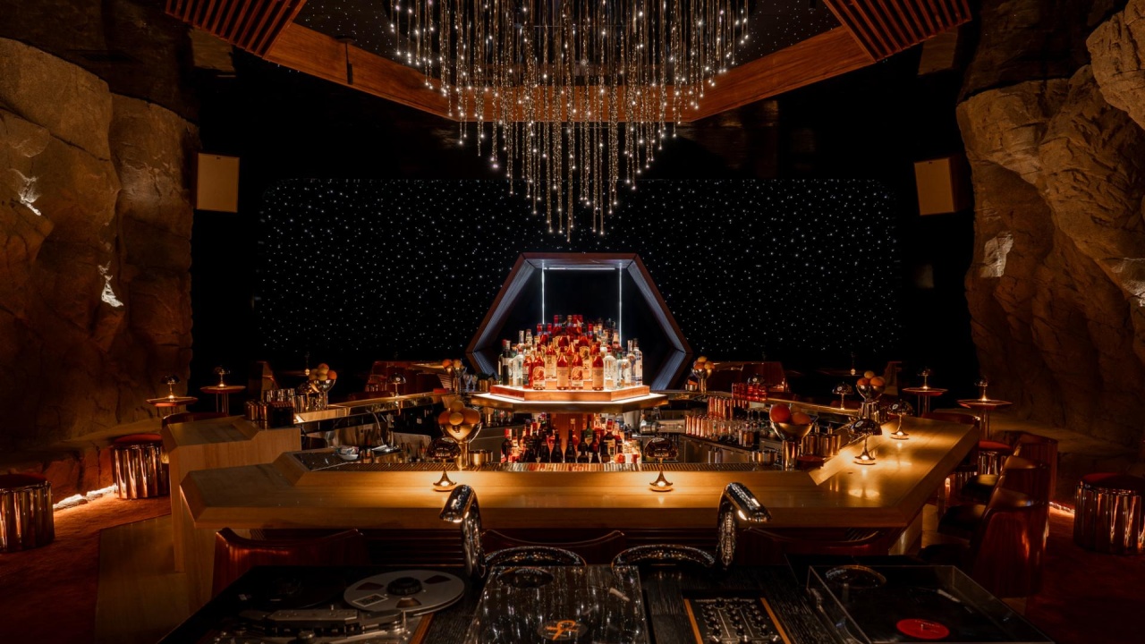At the heart of the space, a hexagonal bar in travertine and wood anchors the room beneath a chandelier reminiscent of a starry night sky, a nod to both the bar’s name and its cinematic inspirations. Warm tones of copper, walnut, and velvet create an intimate, grounded atmosphere, while a mirrored ceiling amplifies the cave-like drama, expanding the visual experience for every guest.