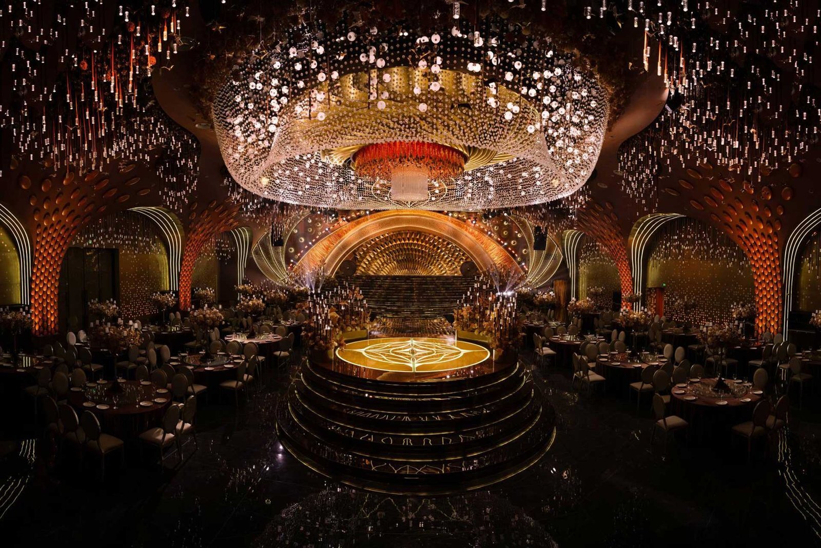 Adding to this majestic ambiance is the main stage, which echoes the grandeur of the 2022 Oscars Awards ceremony stage crafted by the famed artist David Korins. Its design features swirling lines of gold and silver and a dazzling array of lights that spiral outward, creating a hypnotic, geometric illusion. This setting transforms the hall into a veritable palace of splendor, where luxury and grandeur reign supreme.