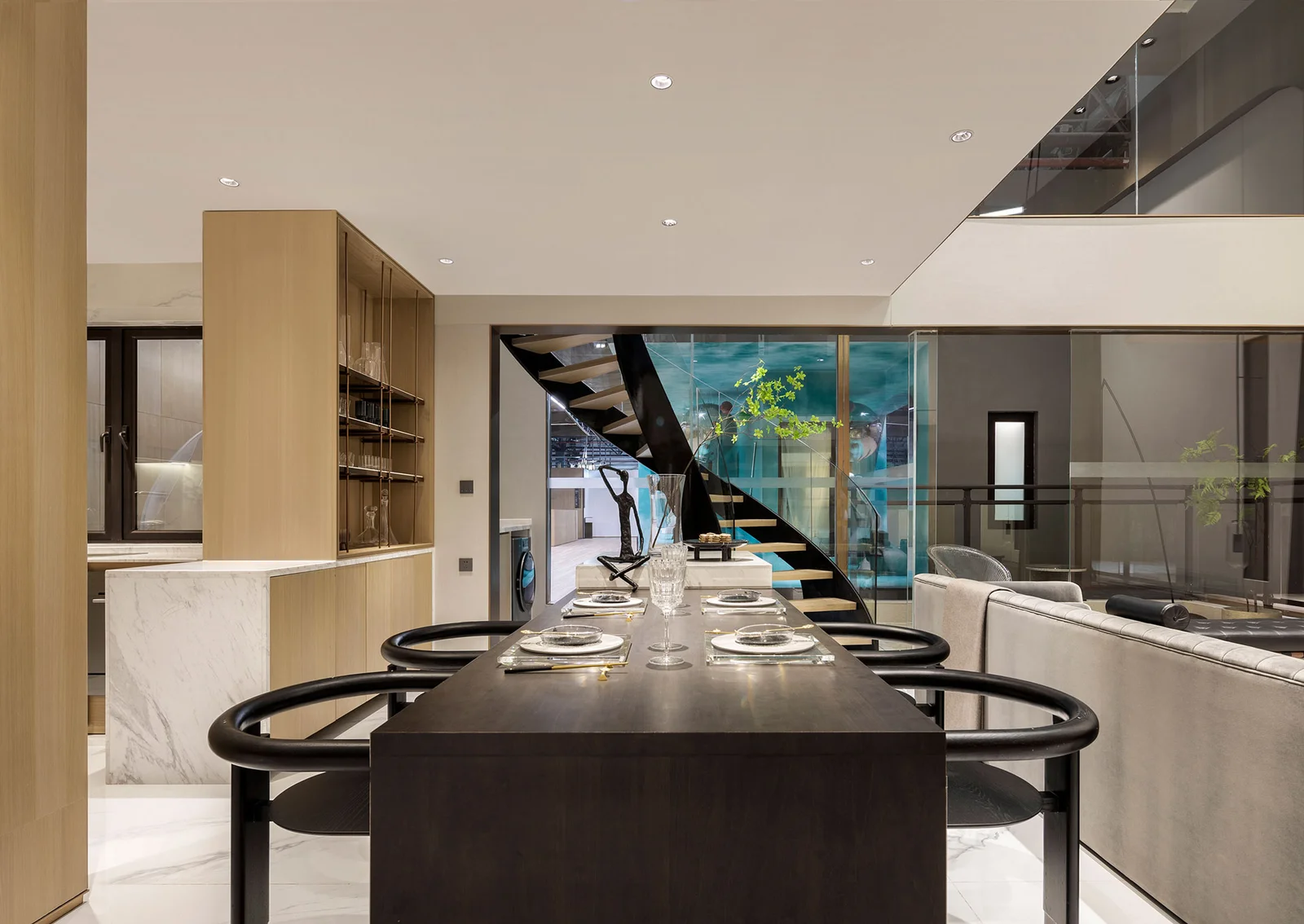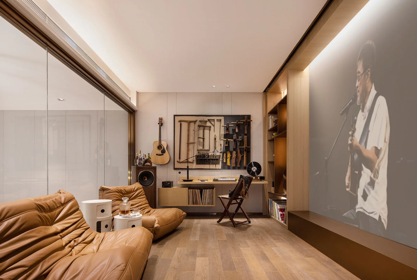 Besides that, the flexible glass soft decoration and the interspersed black, white, and wood colors create a space integrating warmth and rationality, and also sketch a simple and arbitrary private life.