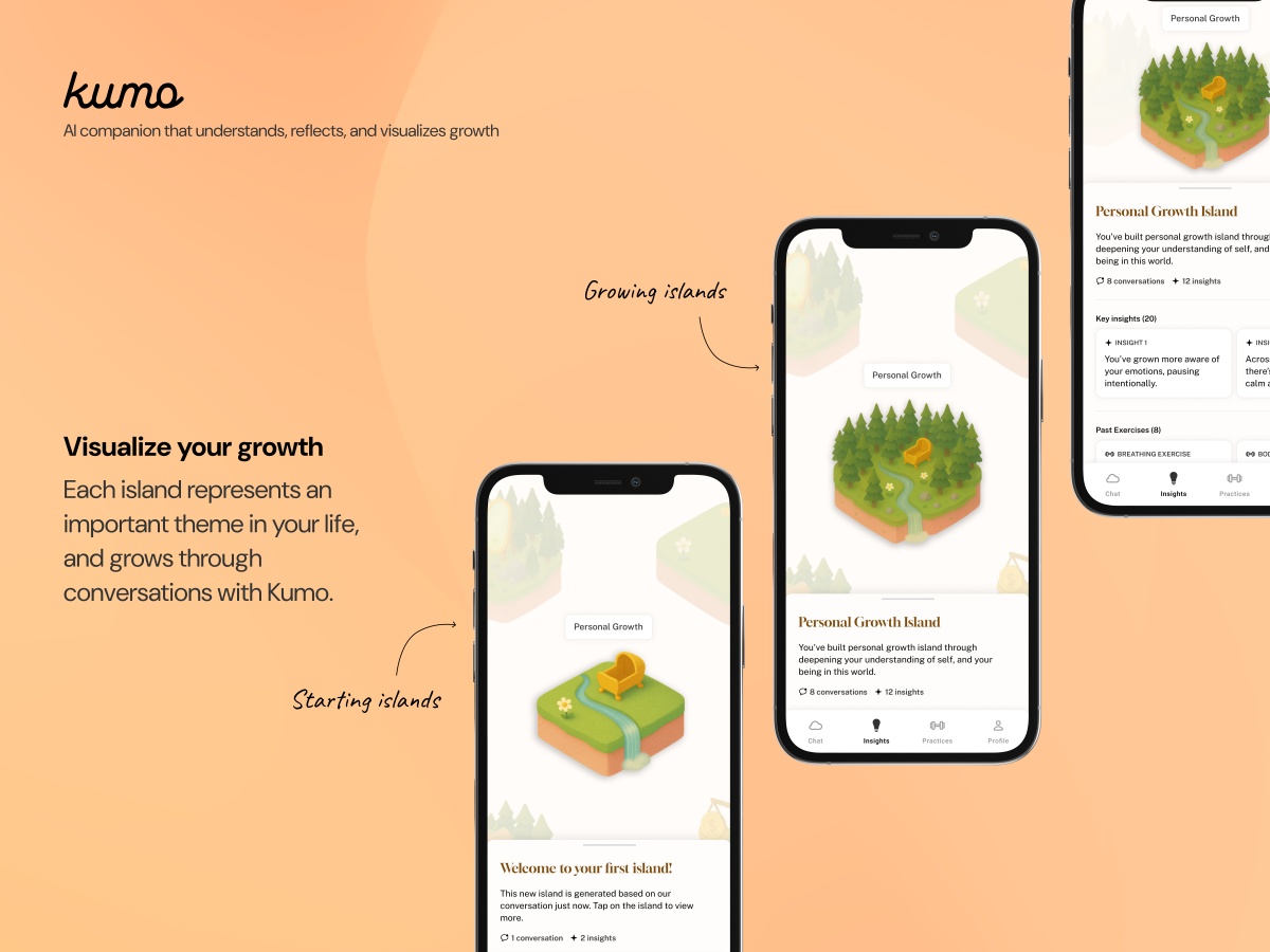 With Kumo, for example, we iterated many times to move beyond a simple chat flow and shaped an immersive island-based experience where growth is visual, playful, and long-term. The entire Kumo Islands concept and its light gamification follow this core value of making design feel meaningful, relatable, and grounded in real human progress.