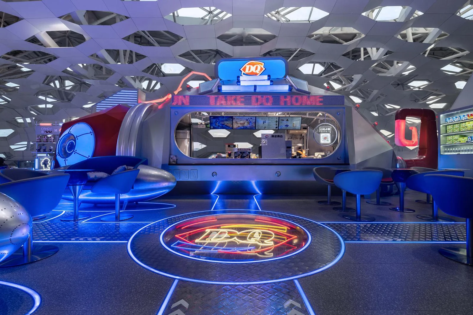 Welcome to the DQ store located within Shenzhen's Bao'an International Airport, a place where you can experience the charm of sleek metal, neon lights, and playful surprises. This 208-square-metre haven, designed by Lion Design, transcends the ordinary retail experience, transporting you to a captivating "Cosmic Space Station."