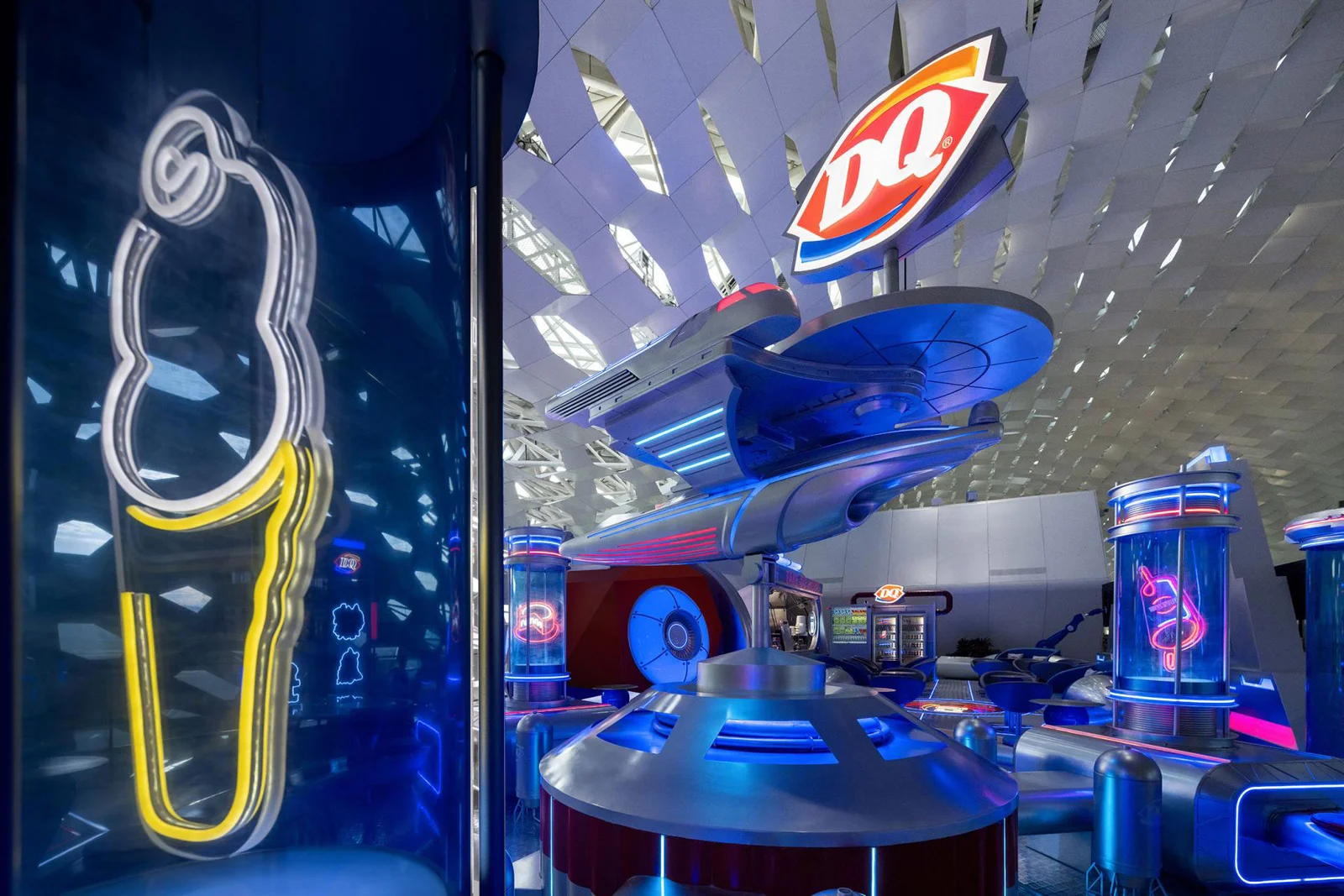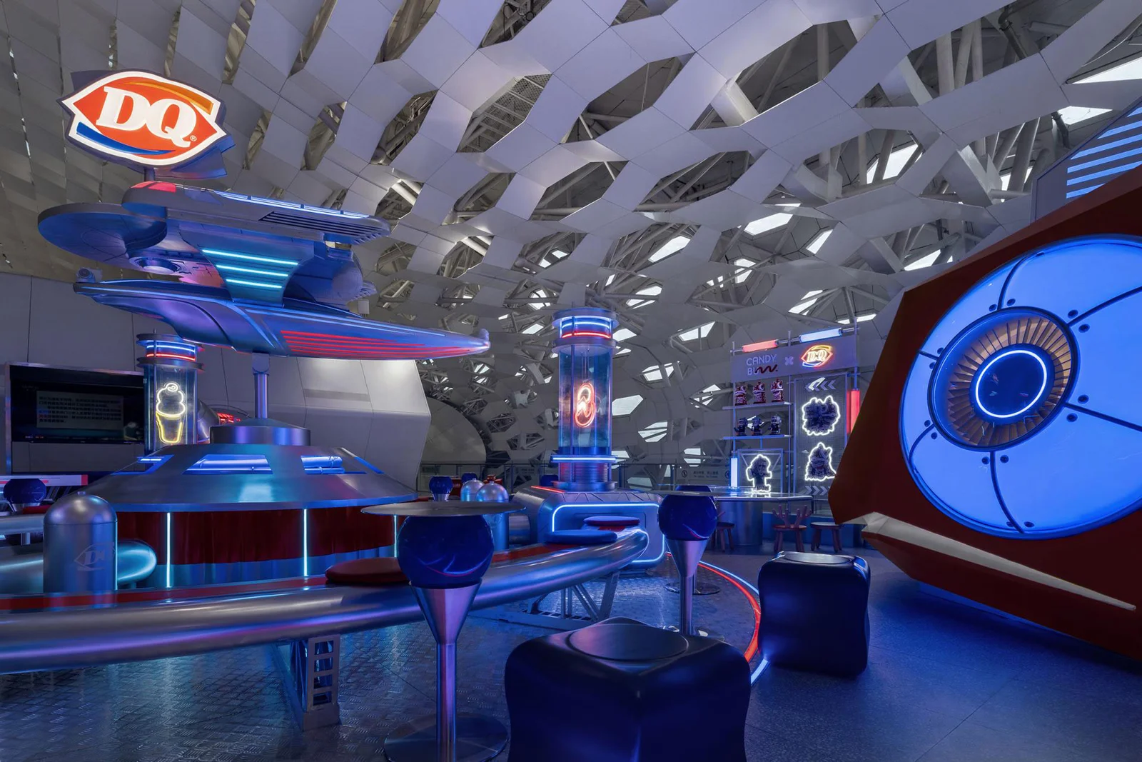 From the moment you approach, the entrance becomes a portal to adventure. Imagine sturdy, textured grey panels resembling spaceship airlocks, framing a doorway bathed in the cool glow of red and blue light bars – a nod to the iconic DQ logo. Two digital displays act as windows, showcasing the brand's heritage and future, whetting your appetite for the space odyssey ahead. Don't miss the eye-catching photo op: a vibrant red astronaut juxtaposed against psychedelic neon pillars, blending virtual and real in a touch of playful sci-fi fun.