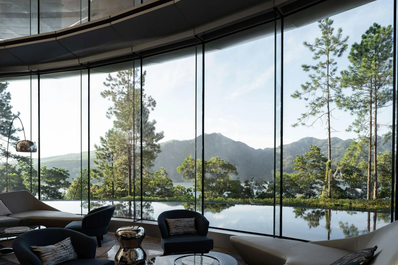 Symbolic architectural language is used throughout the design to create connections with local resources, the environment, flight culture, and historical roots. The building’s facade features a glass curtain structure on all floors, ensuring that every corner offers breathtaking views of the reservoir. Silver-gray aluminum plates adorn the eaves, carefully balancing form and structure proportions. The landscape design integrates organically with the mountain, evoking a sense of floating, science, and future aspirations, highlighting the community's enthusiasm for the aerospace industry.