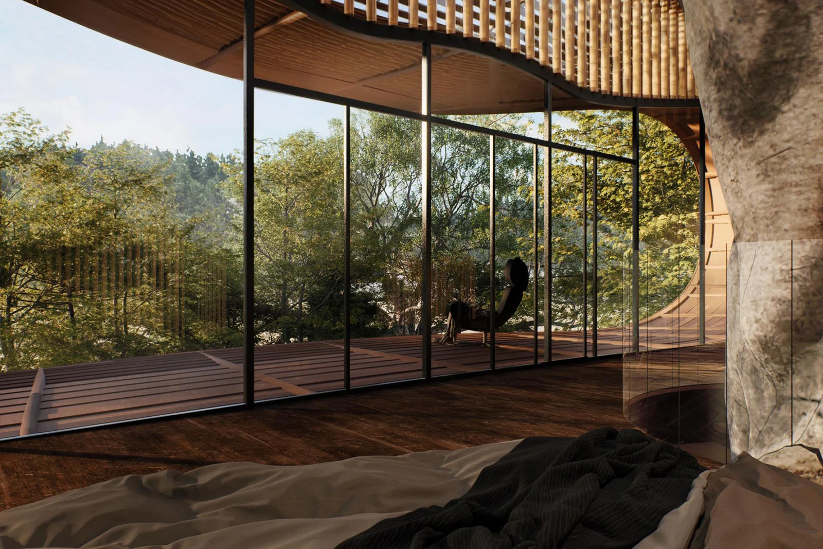 Perched among the trees, this innovative structure invites guests to relax in the forest canopy, where they can fully immerse themselves in the beauty of their surroundings. The unique design, with its elevated position and seamless integration into the natural environment, encourages visitors to slow down, reflect, and appreciate the tranquillity that nature offers.