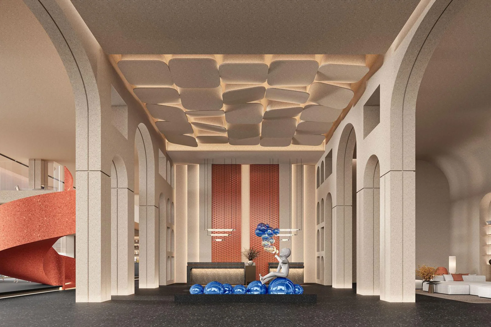 Imagine a space where French arches mingle with Chinese elegance, their graceful curves mimicking the gentle flow of the nearby lake. This is the captivating lobby of the Yanhe Garden Hotel, where the past playfully shares secrets with the present through carefully curated details. Wood, gypsum, and metal intertwine in a harmonious dialogue, their contrasting textures adding depth and character. A whimsical installation of blue bubbles, reminiscent of childhood memories, evokes a sense of playful freedom, reminding guests to embrace the joy of simple pleasures.