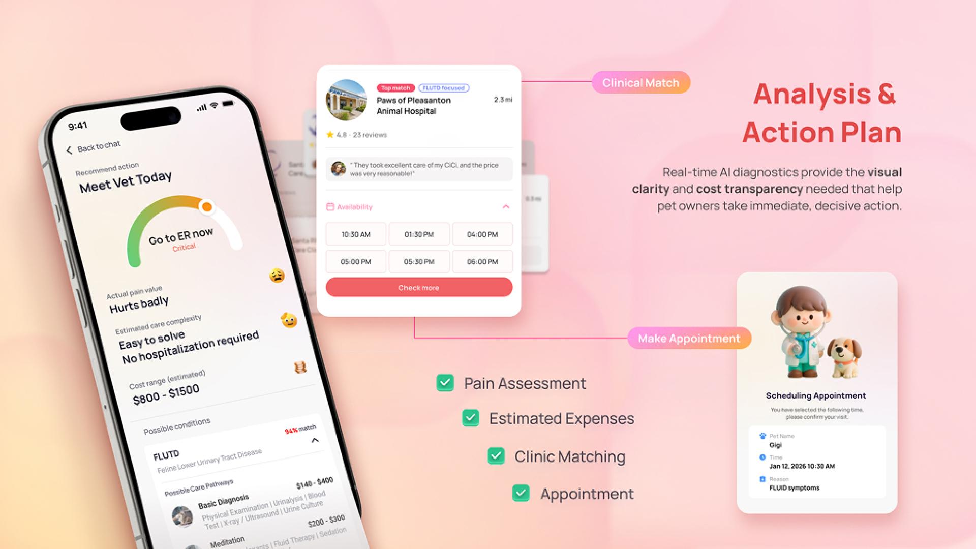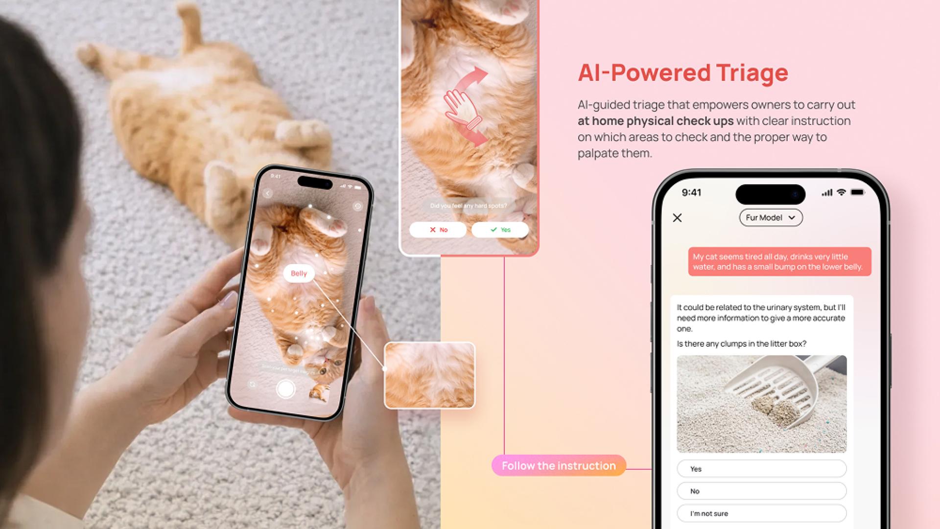 Furever.AI analyzes subtle symptoms through a pre-visit visualization model, translating them into clear, visual insights for pet owners. Instead of presenting complex data, it organizes information into simple, structured guidance that is easy to understand. This allows users to better assess potential conditions before a veterinary visit and supports more informed, efficient decision-making.
