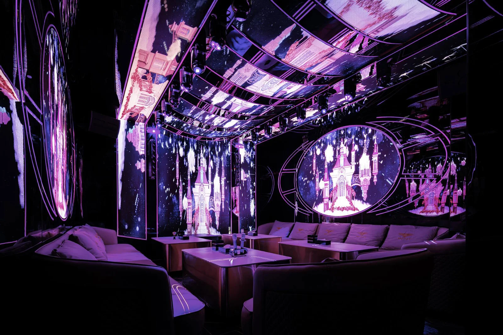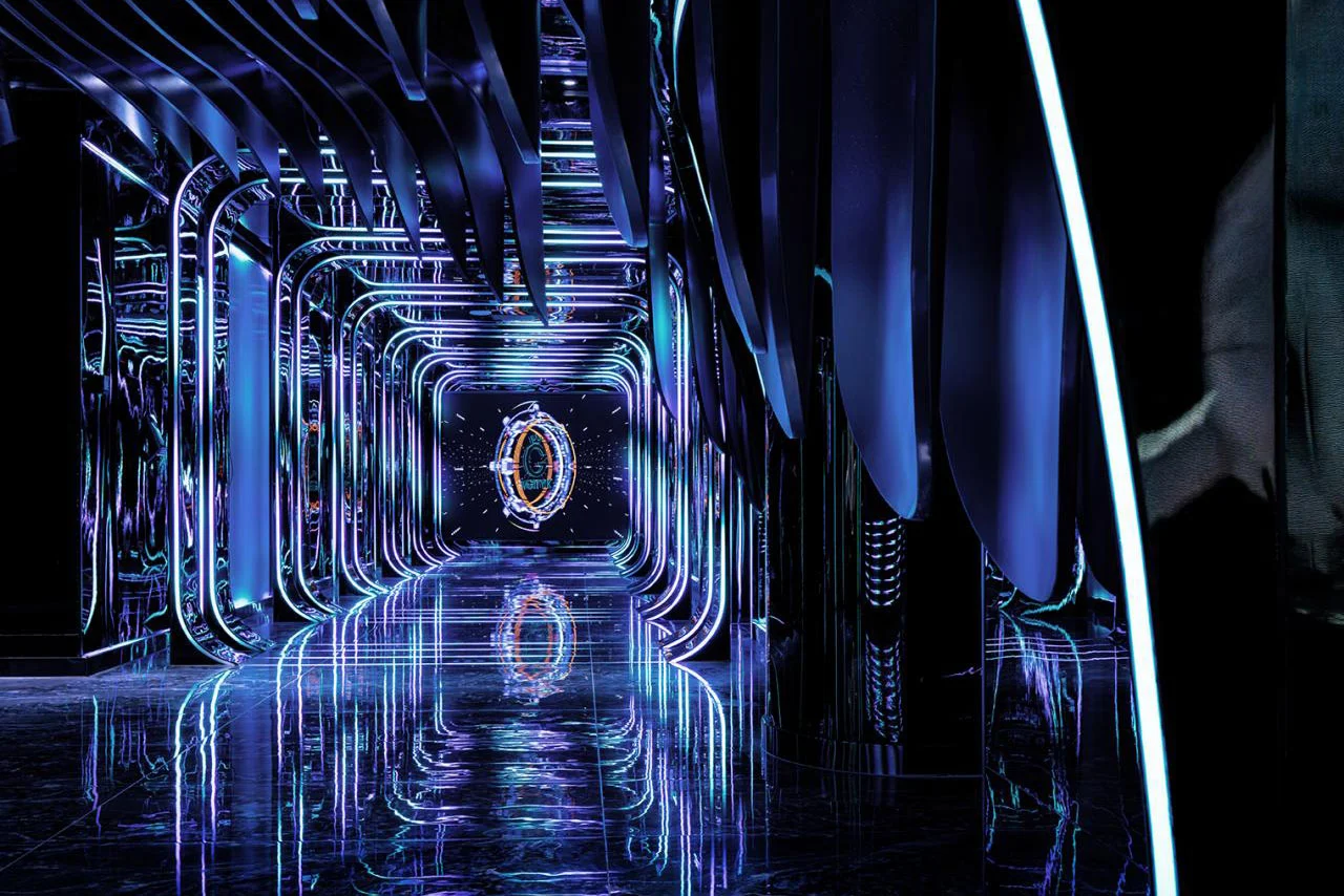 As you venture further, the art corridor leading to private rooms acts as a natural guide. The interplay of light and darkness, connects the private and public areas, leading visitors into scenes with different themes and creating a varied space-time experience within a limited area. The design extends the private room area into the public space, utilizing materials like black titanium with a mirror reflection effect, fiberglass, and aluminum veneer. Combined with colorful lighting, this creates a cool and intriguing light-shadow environment, enhancing the space's sense of fashion and fantasy and increasing consumer interest.