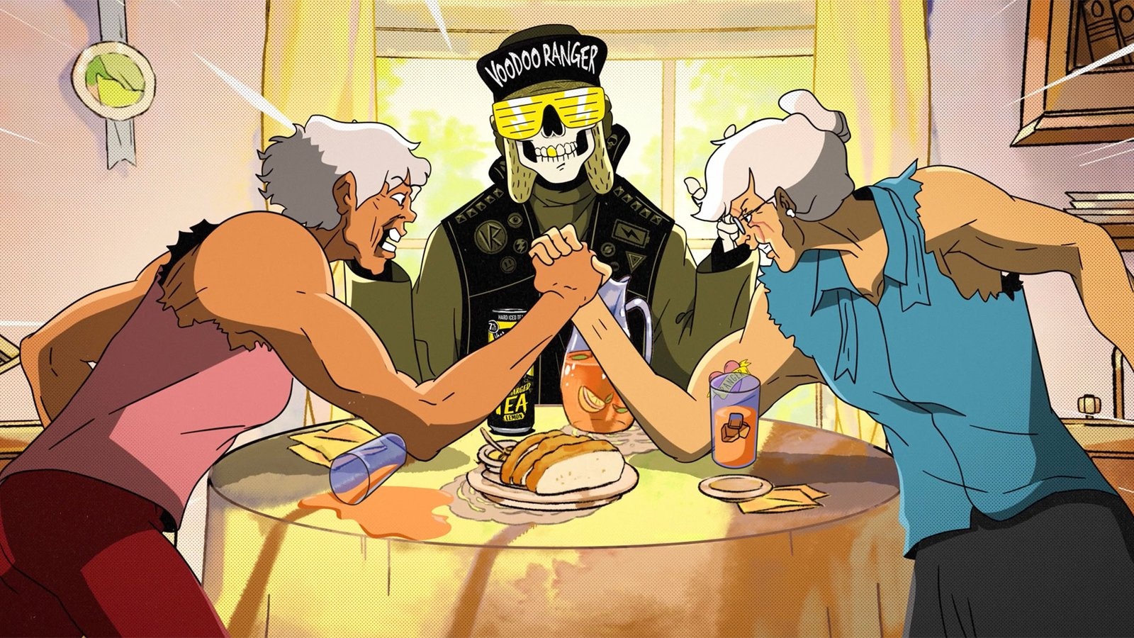 However, the narrative soon takes a sharp, comedic turn with the introduction of the Voodoo Ranger Hardcharged Tea, a new product boasting a bold 7% alcohol by volume. In a clever transformation, the peaceful scene escalates as the grandmothers are visibly transformed into muscular, macho versions of themselves, illustrating the "charged" impact of the beverage.