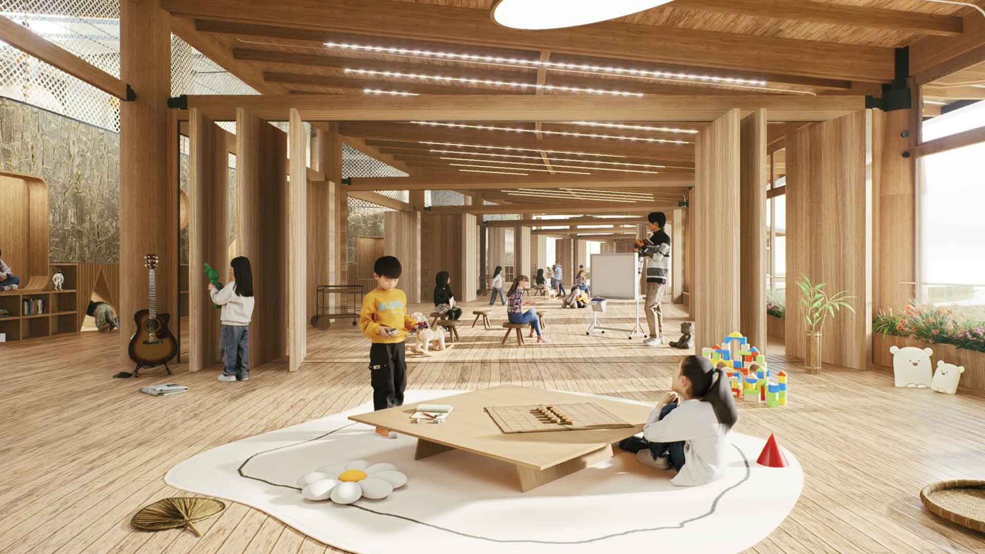 Equally important is the way the project embraces sustainability and adaptability. Natural ventilation, solar power, mist irrigation, and stormwater reuse all work together to reduce the building’s footprint. Flexible spaces encourage diverse methods of teaching and collaboration, while the choice of materials balances durability with comfort. This attention to detail ensures the kindergarten will serve generations of students while remaining mindful of its responsibility to the environment.