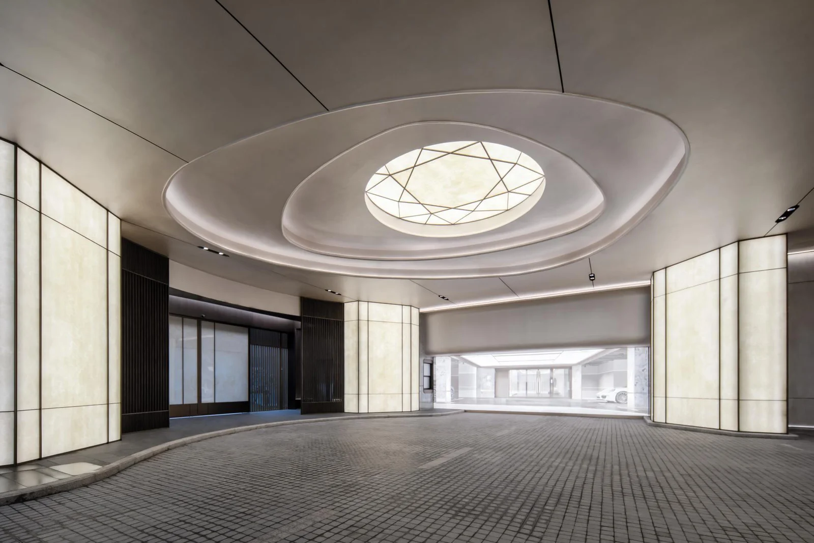 Upon entering the clubhouse, visitors embark on a captivating spatial experience. The entrance, featuring a captivating metal panel adorned with an abstract mountain-and-sea motif inspired by Kejia People traditions, sets the tone for the journey ahead. The two entrances, one for pedestrians and one for vehicles, converge at the entrance plaza and sunken courtyard, leading to the reception hall.