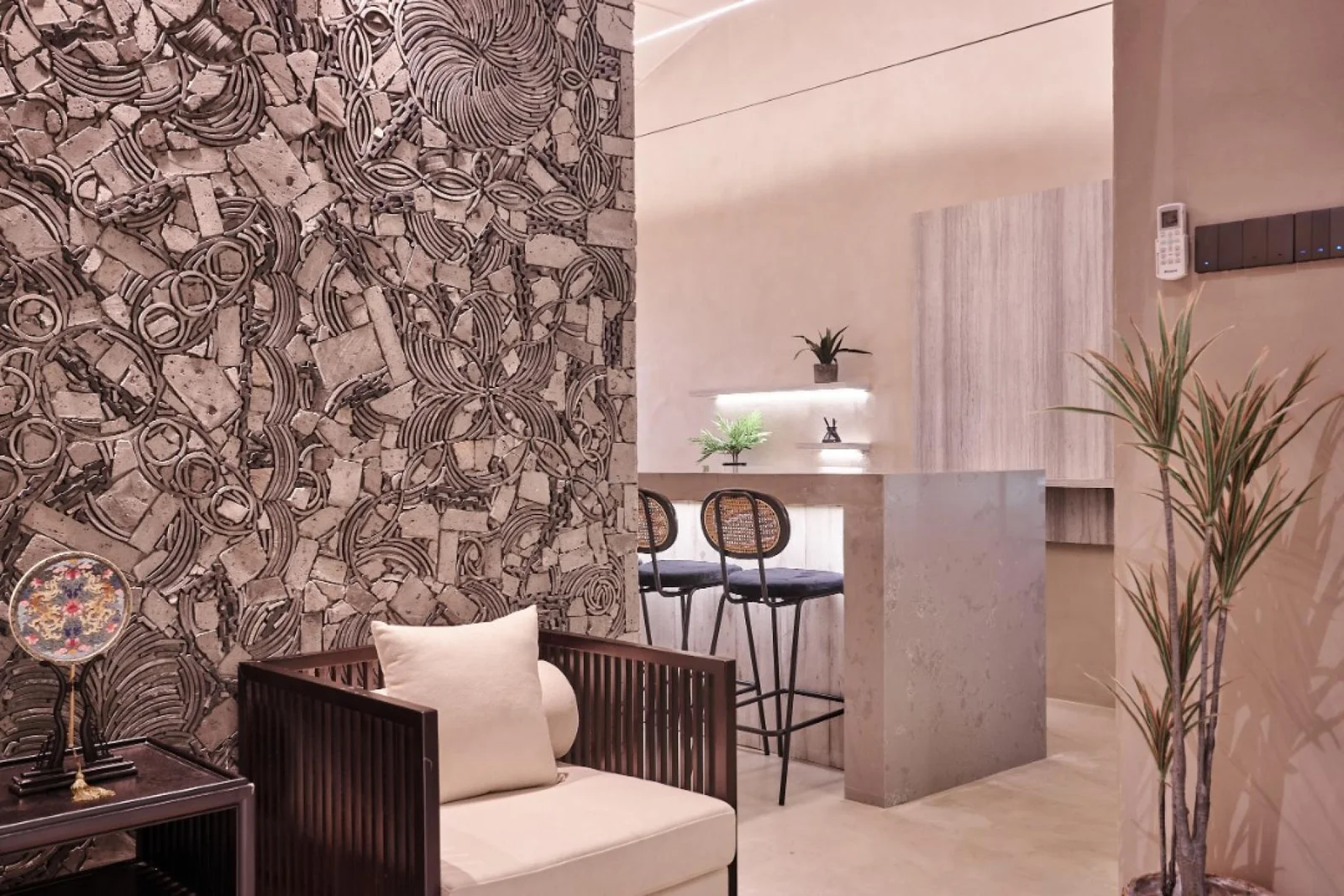 The designers created an accent wall that was completely made out of tiles and designated that particular spot to be the main focus of the office. It does not only act as an enrapturing visual art piece but also assumes the role of a symbol, tranquility and luxury. The office furniture and finishing were utilized with a very expensive material to emphasize class which resonates fittingly with the client.