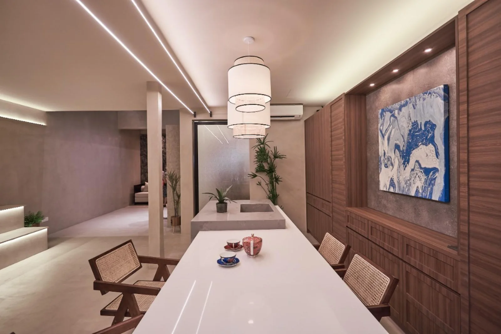 The overall theme was constructed to emit a unique sense of luxury and combined it with a peaceful ambience to increase its luxurious ambience. The objective was to allow everyone working in the office to experience an ambience that felt peaceful and homely. The material that was incorporated in the structure of the office uses the latest microcement technology to produce a seamless design that travels around the office. Opting for lighting that is not commonly used adds exclusiveness and classiness to the office itself.