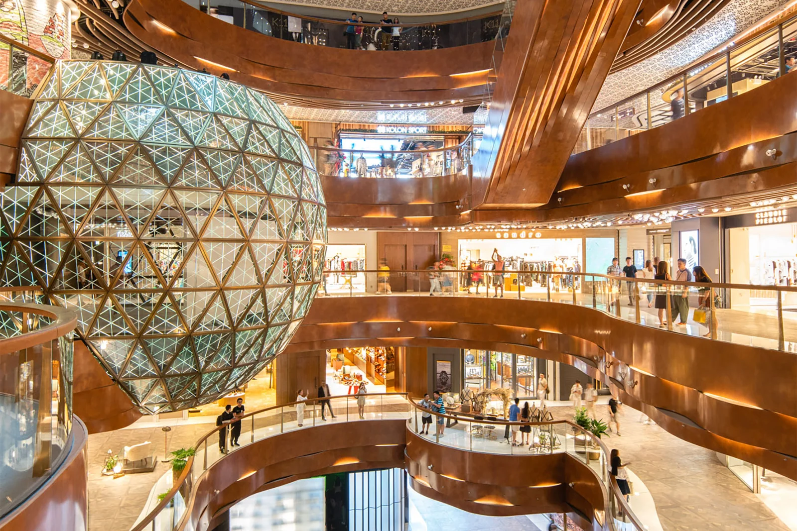 Visitors are immediately immersed in K11's Journey of Imagination upon entering the atrium, known as the Opera Theatre. This space features hundreds of meticulously positioned lights that resemble a galaxy, forming a "galaxy of creativity." The centerpiece, Escalating Climbers, is an organic, root-like sculpture that ascends towards the Gold Ball, a multi-dimensional exhibition and event space wrapped in gleaming latticework. The Gold Ball appears to float beneath the Oculus ceiling sculpture, with filtered sunlight creating a cathedral-like effect.