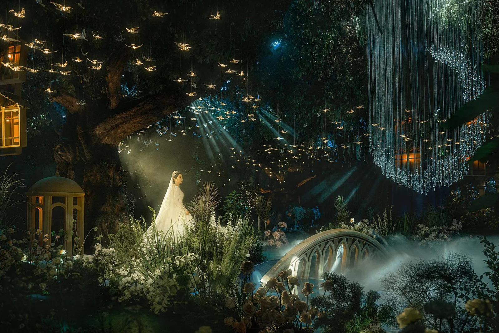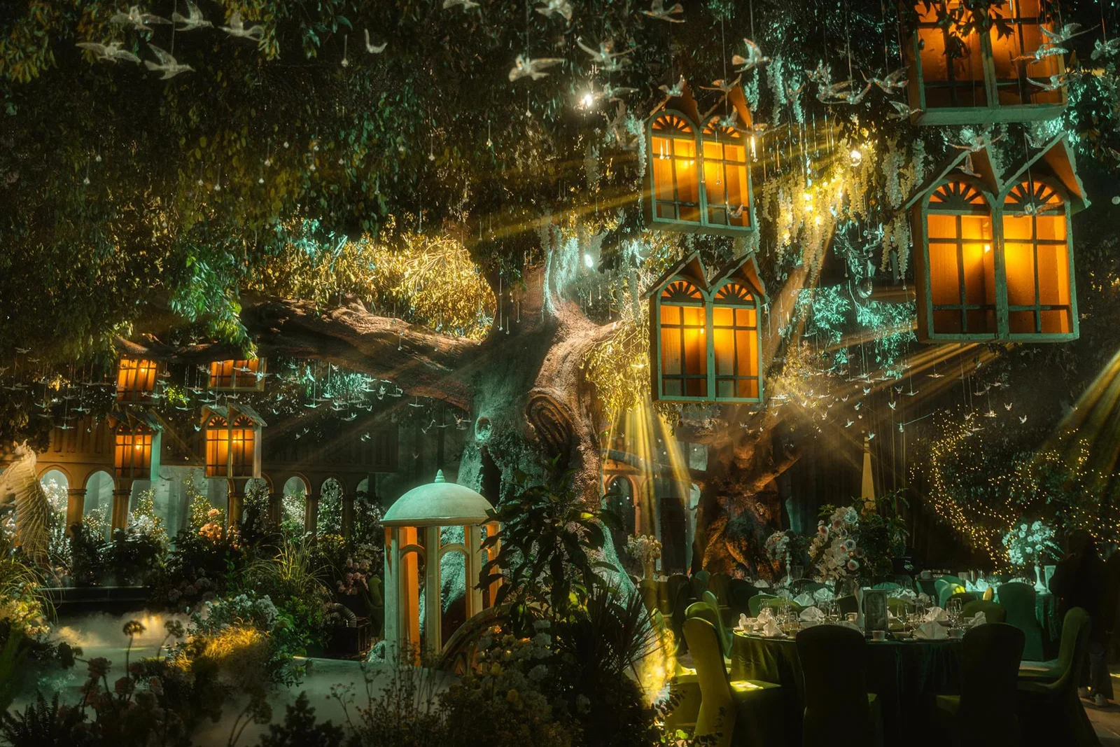 This was a stunning project for its aesthetics and its talent in weaving a captivating narrative, where every minute detail seemed to murmur the couple's beautiful love storey. An octagonal manor metamorphosed into the Ionian Enchanted Forest, complete with towering trees, cascading foliage, and hidden tables seamlessly woven into the scene. Interactive elements like shimmering lights, flowing water, and wisps of dry ice added an extra layer of magic, blurring the lines between reality and the digital realm.