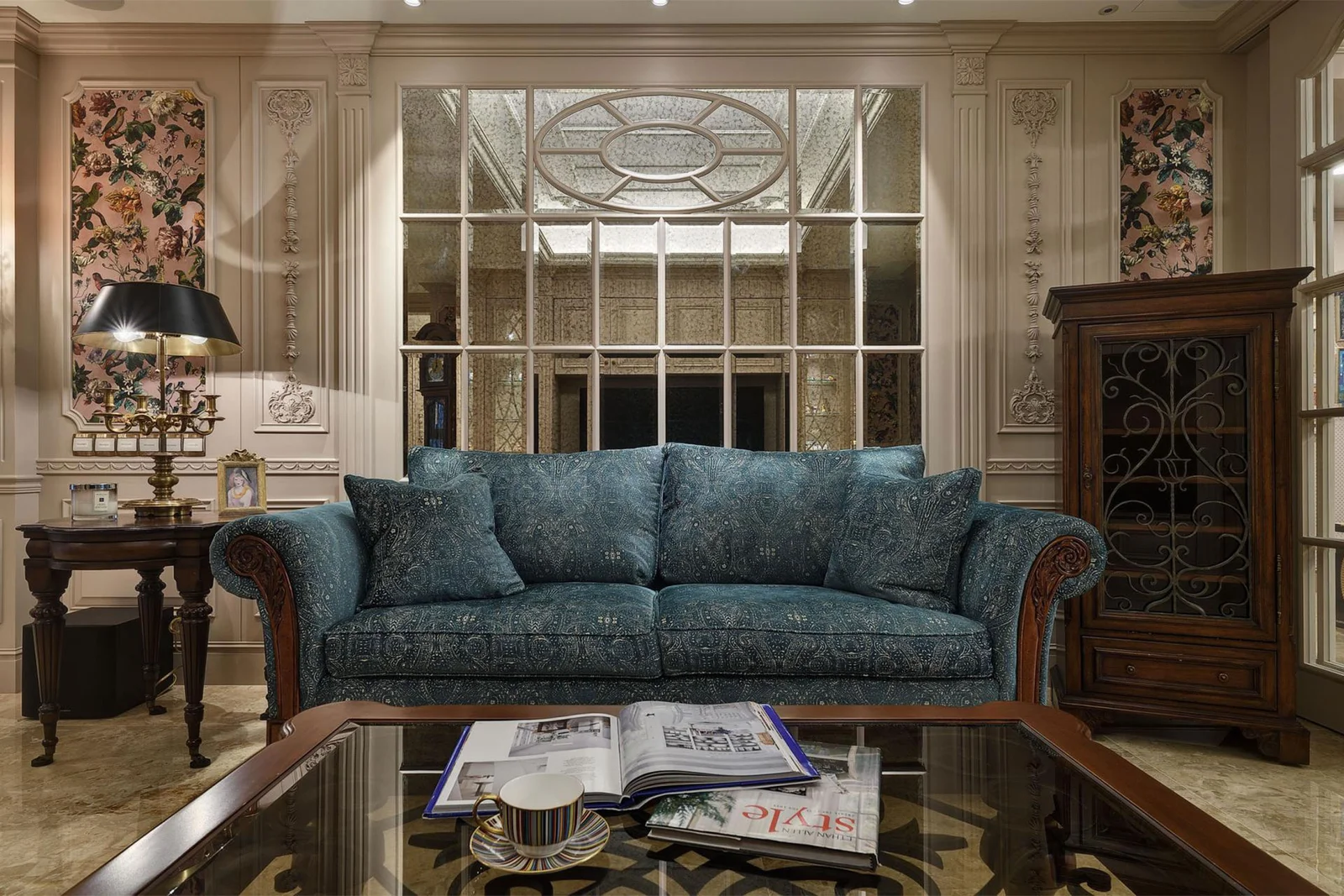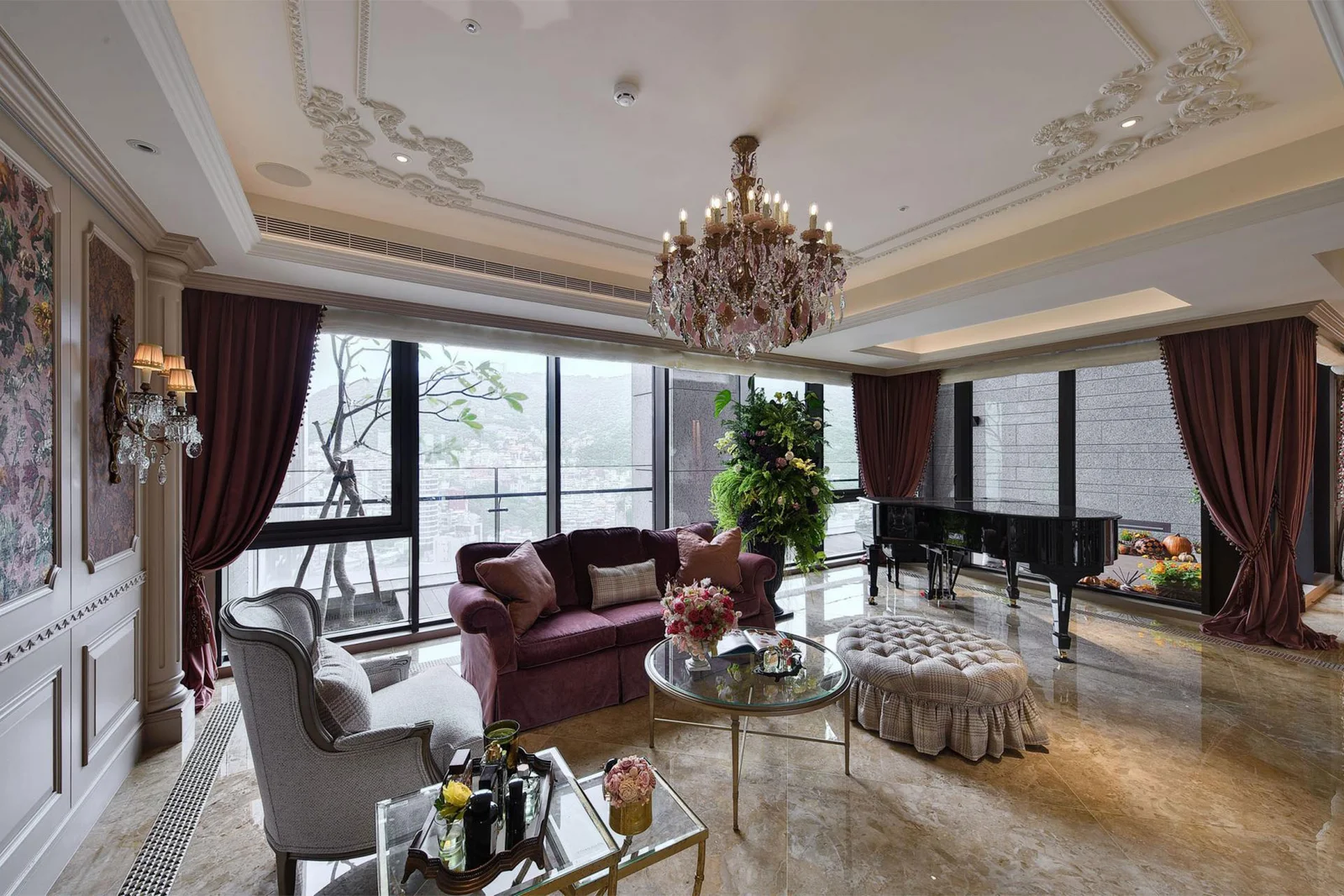 The design draws inspiration from lavish classical aesthetics, using bold color schemes and intricate detailing. The ceilings feature exquisitely painted three-dimensional cornices, while natural stone, patterned floral and avian wallpapers, and detailed floor mosaics contribute to the sense of luxury. Custom-made furniture, mineral crystal chandeliers, tapestries, and plaid wool accents further enhance the richness of the space, evoking the grandeur of iconic French salons.