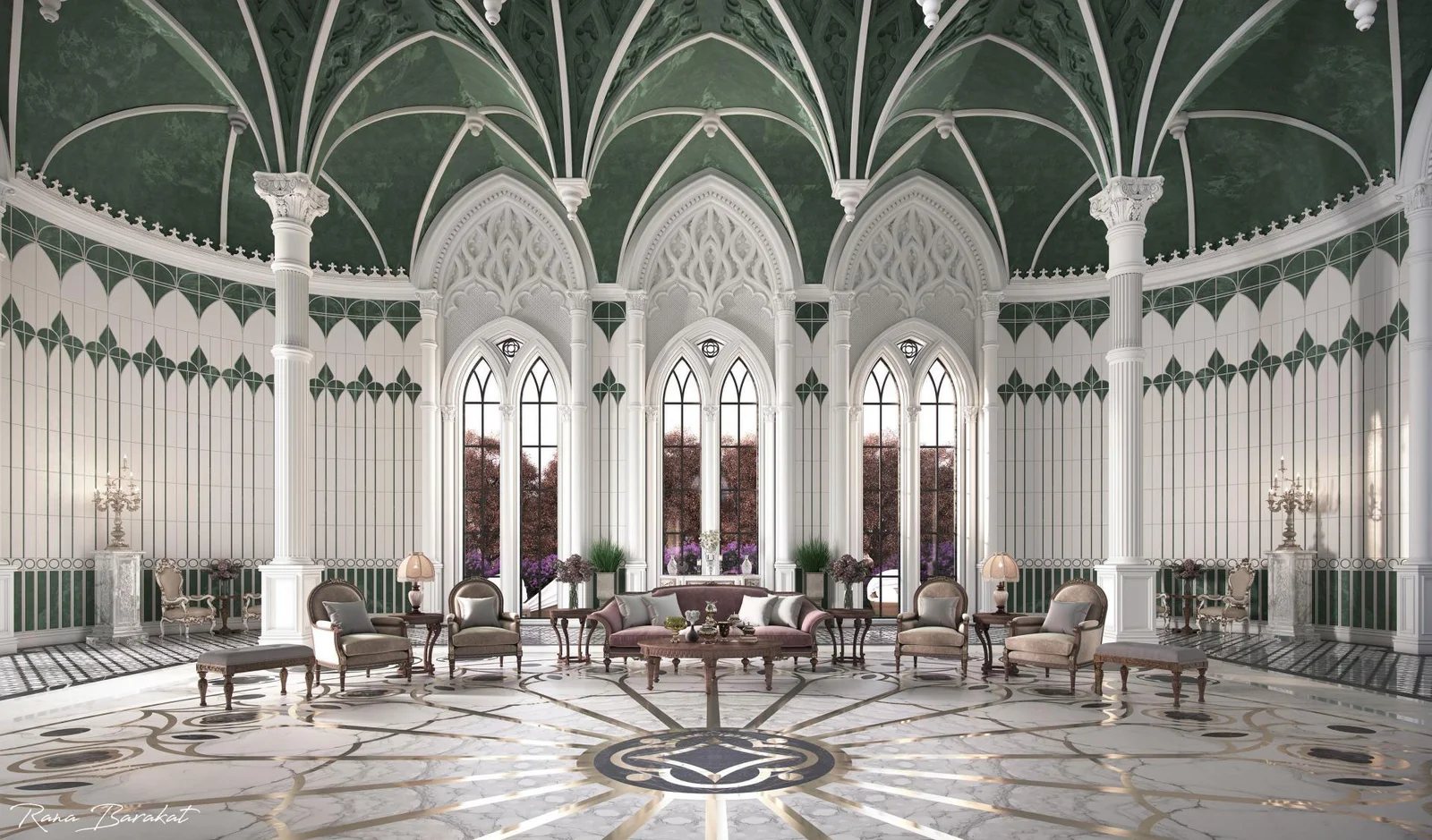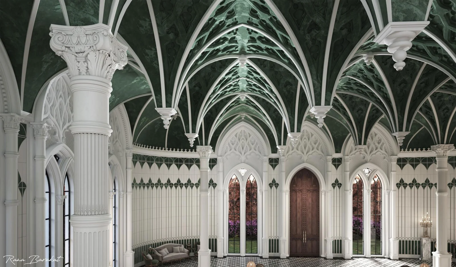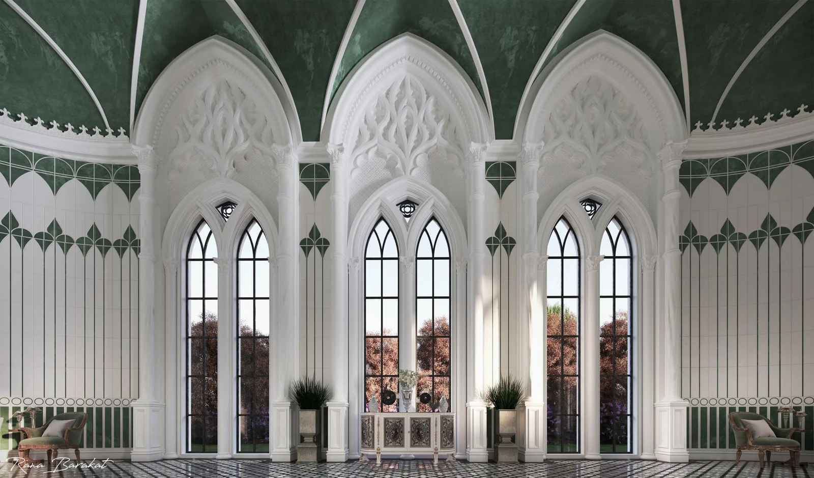 As one steps inside, Rana Barakat intends on allowing the soaring arches to immediately captivate the senses, recalling the grandeur of ancient cathedrals and medieval marvels. The walls, adorned in pristine white, become a canvas for intricate Gothic patterns that dance across their surface, infusing the space with an enchanting mystique and a profound sense of historical significance. Standing with quiet majesty amidst the lobby's elegance are stately white columns, their classical design echoing the timeless aesthetic of the Gothic era, adding a touch of grandeur and nobility to the environment.