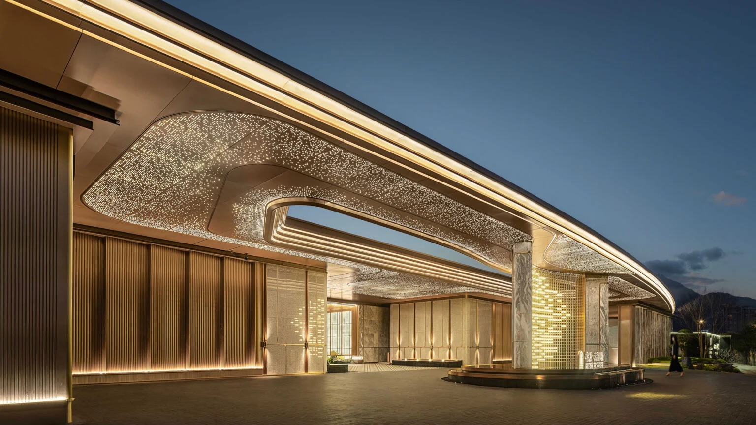 The visitor’s journey through RIVERS OF GLORY feels like stepping into a story that reveals itself one scene at a time. Arrival at the drop-off area offers the first glimpse, a view perfectly framed by a metal hollow-out screen, hinting at the courtyard beyond and the spaces still to come. A gentle turn along a ninety degree path shifts the perspective, drawing guests into a tall, light-filled viewing corridor. Here, a water courtyard wrapped in a soft veil of mist blurs the edges of reality, while a glowing wall of translucent cloud stone adds a quiet sense of drama.