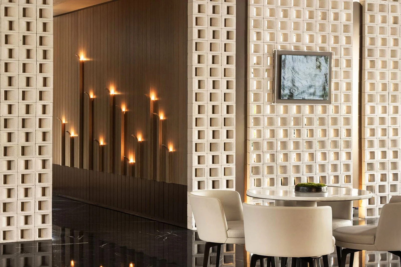 As light filters through the hollow wall, creating enchanting spots of illumination, guests are transported to a serene landscaped courtyard within the space. The juxtaposition of rough stone and delicate leather presents a captivating collision of aesthetics, igniting the imagination and hinting at the possibilities of an ideal future life. The STARRY SKY project invites visitors to engage in meaningful conversations, enveloped by the physical and mental pleasures of the space, ultimately returning to a state of inner ease and comfort.