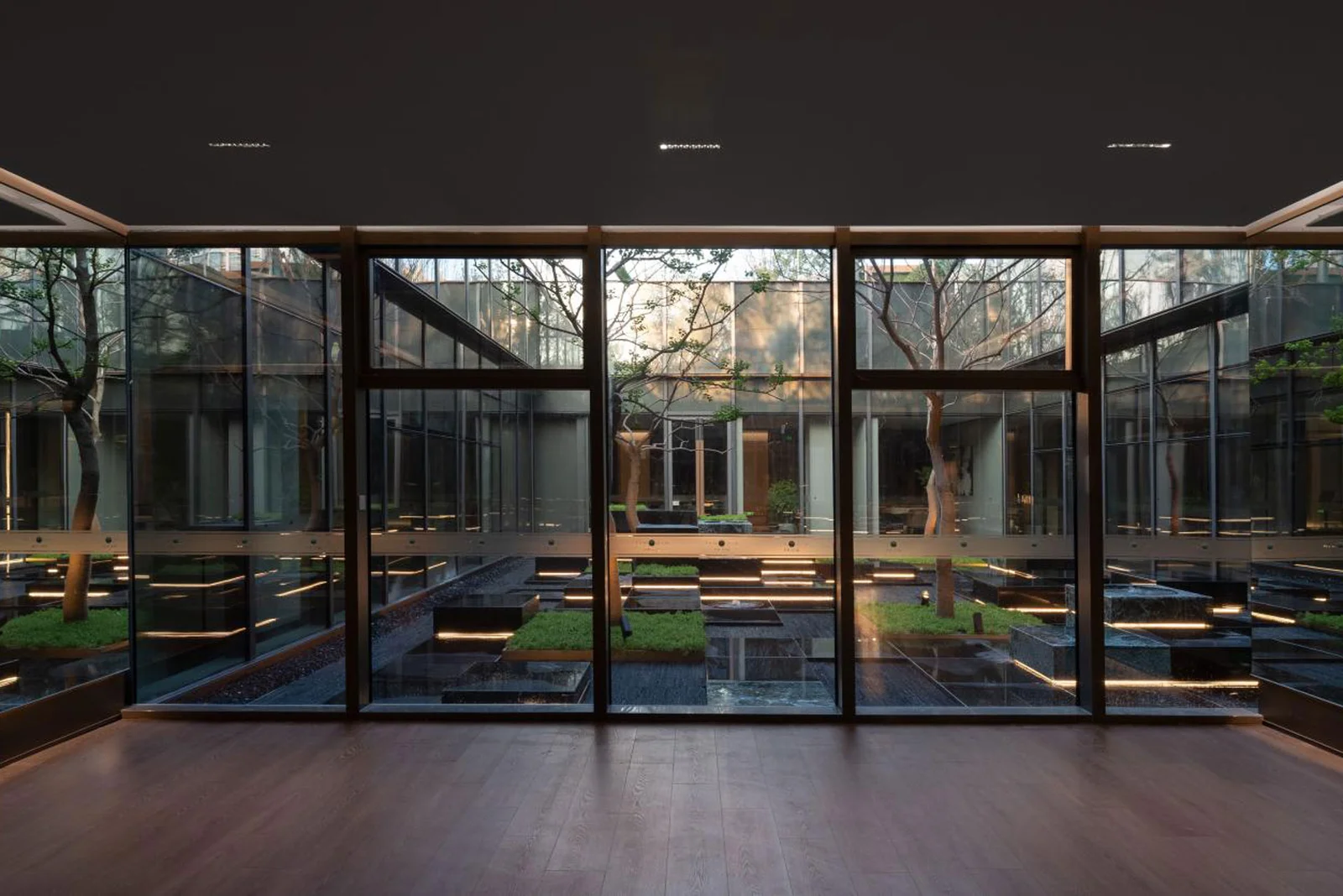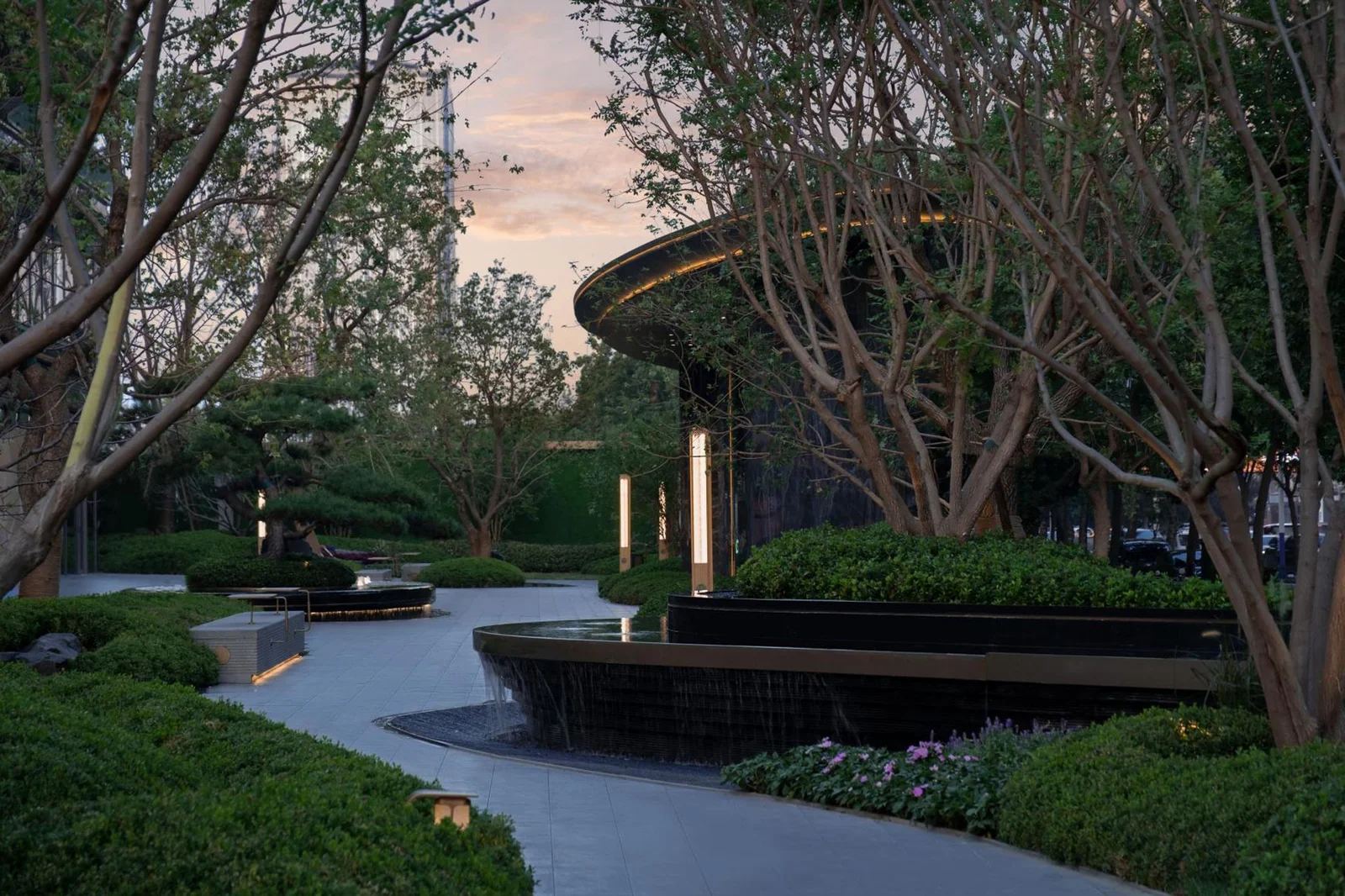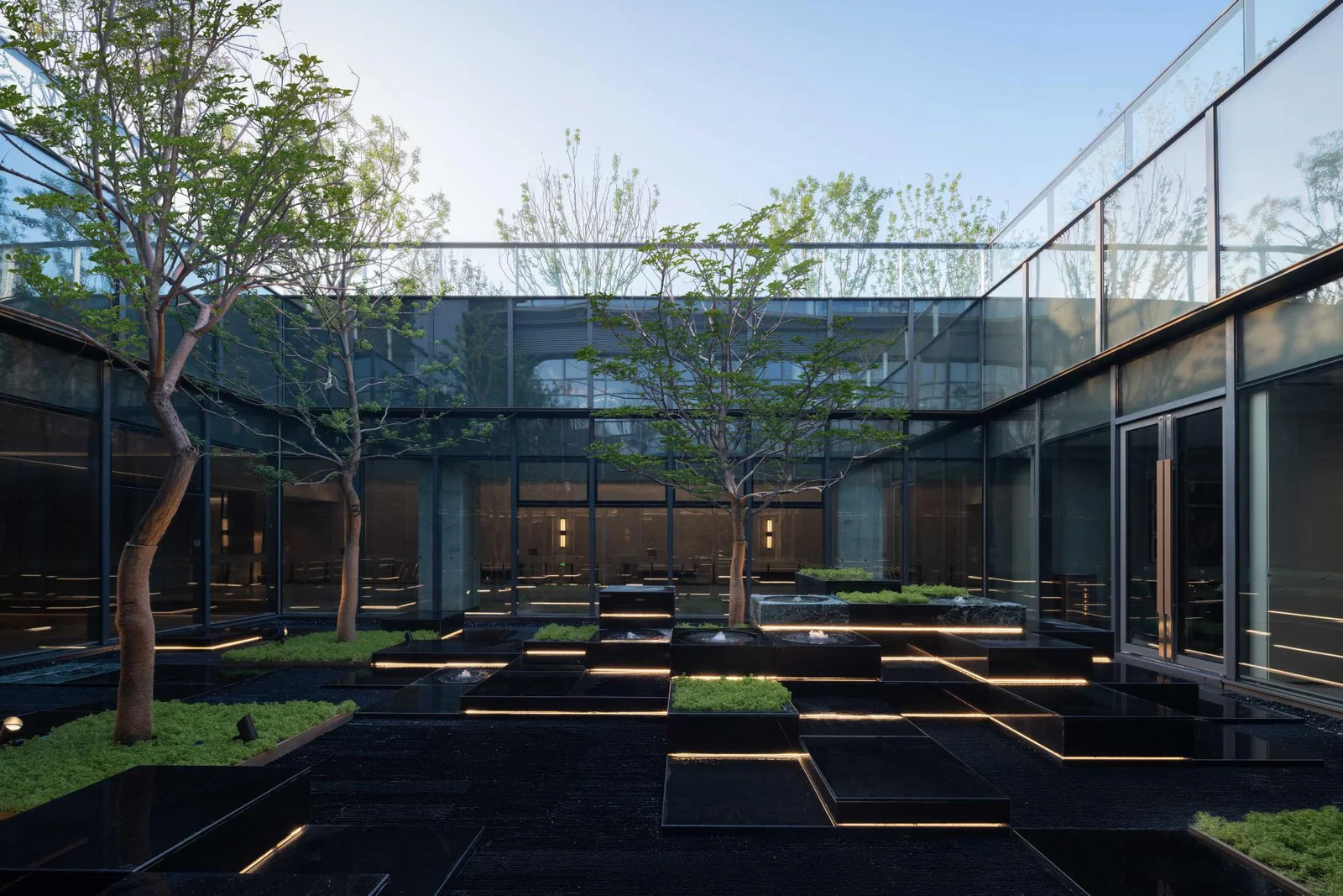 Descend to the underground courtyard, a haven where nature reigns supreme. Lush greenery and meticulously crafted details paint a picture of tranquillity, while the simplified forms and flowing lines evoke the essence of "floating clouds and flowing threads." The outstretched balcony extends from the building's exterior, weaving a dance of light and shadow.